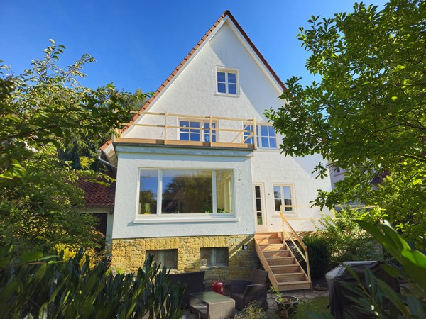 Im Obergeschoss erwarten Sie drei helle Schlafzimmer, zwei stilvoll modernisierte Bäder und eine Diele mit Zugang zu einem Balkon – ideal, um den Blick über das grüne Umfeld schweifen zu lassen.