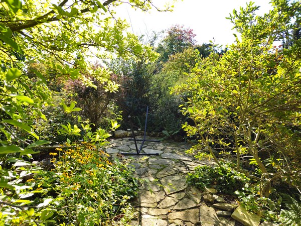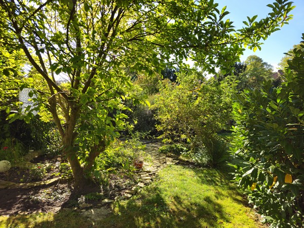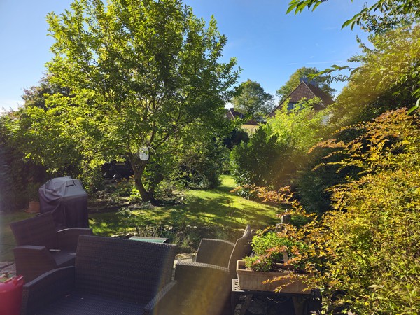Das nach Südwesten ausgerichtete Grundstück präsentiert sich als traumhaft eingewachsener Garten mit Bäumen, Sträuchern und zwei sonnigen Terrassen. Hier genießen Sie Privatsphäre und Idylle mitten im Grünen.