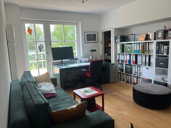 Der großzügige Wohn-/Essbereich mit offenem Durchgang bildet das Herzstück des Hauses. Eine angrenzende Bibliothek lädt zum Verweilen und Lesen ein, während die Küche mit Zugang zur oberen Terrasse zum Treffpunkt für Familie und Freunde wird. Von hier führt eine Treppe mit wenigen Stufen hinunter in den Garten. Eine praktische Speisekammer, ein Abstellraum, die Diele, ein Windfang sowie ein Gäste-WC mit Vorraum ergänzen das Raumangebot.