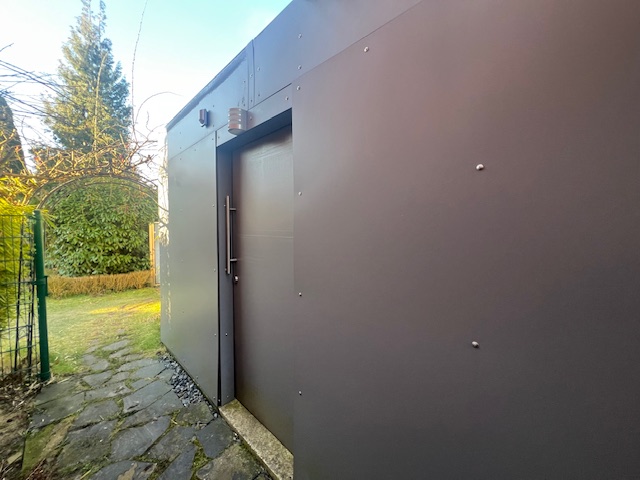 Als Stauraum für Gartengeräte etc. gibt es ein stylisches Gartenhäuschen in Kubusform.